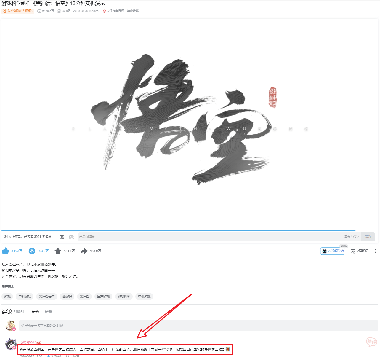自己把黑神话官号此前的宣发视频全部重看了一遍,“我在埃及当刺客,在异世界当猎魔人,当猎龙者当骑士,什么都当了。现在我终于看到一丝希望我能回自己国家的异世界当猴哥”这句热评至今仍震撼我心。